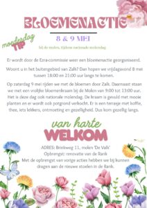 Op 8 en 9 mei organiseert de Ezra-commissie een bloemenactie bij molen ‘De Valk’ in Zalk. Vrijdagavond 8 mei komen ze langs in het buitengebied en op zaterdag 9 mei is er van 9:00 tot 13:00 uur een bloemenkraam bij de molen, met planten, potgrond en een gezellig terras met koffie en iets lekkers. De opbrengst is bestemd voor de renovatie van de Rank.